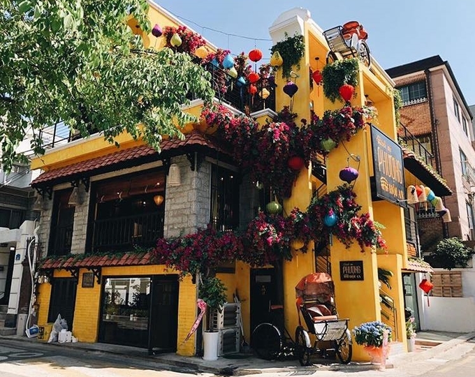 Bánh mì Phượng trên đường Phan Chu Trinh, Hội An được các trang báo, diễn đàn du lịch lẫn chuyên gia ẩm thực nước ngoài dành nhiều lời khen, trở thành một trong những tiệm bánh mì nổi tiếng nhất Việt Nam. Ngày 4/5, tiệm vừa mở chi nhánh tại khu Yeonnam, quận Mapo, Seoul. Căn nhà ba tầng sơn màu vàng nổi bật giữa những tòa nhà hiện đại ở thủ đô Hàn Quốc.Chất Hội An thể hiện ngay trên tấm bảng hiệu màu đen chữ vàng quen thuộc, cùng biểu tượng chùa Cầu. Bên cạnh đó, những nét đặc trưng nhất của phố Hội như tường vàng, mái ngói âm dương, cánh cửa gỗ màu đen hay giàn hoa giấy… được “bê nguyên xi” sang xứ kim chi.Không gian bên trong thiết kế đậm chất cổ xưa, gợi cảm giác hoài niệm với người từng đến Hội An.Giữa lòng Seoul mà có ban công gỗ lầu hai nhìn xuống đường, đèn lồng vải đủ màu, xích lô hay chiếc đèn dầu, phích nước cũ kỹ trưng bày trên kệ, khiến bạn như đang bước chân vào một tiệm ăn bên bờ sông Hoài ở xứ Quảng.Bà Phượng (áo vàng) từ Việt Nam sang để truyền lại công thức nấu ăn cho đầu bếp, chụp ảnh cùng đội ngũ Hàn Quốc.Thực đơn quán gồm 3 loại bánh mì nhân: thịt nướng, gà với phô mai và thịt bò với trứng. Quán bán kèm các loại nước như cà phê cốt dừa, cà phê sữa đá…Giá một ổ bánh mì 7.000 – 8.000 won (khoảng 140.000 – 160.000 đồng). Đồ uống có giá từ 1.500 đến 5.500 won/phần (khoảng 30.000 – 110.000 đồng).