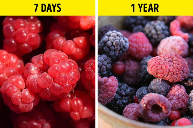 Một vài loại quả thuộc họ berries (quả mọng) có thể lưu trữ được 1 năm nếu bảo quản đúng cách. Cụ thể là chúng cần rửa sạch để loại bỏ hết vi khuẩn, yếu tố bùn đất… rồi để khô nước và cho vào túi zip kín, để trên ngăn tủ đông. Bằng cách này chúng sẽ để được tới 1 năm mà chất lượng vẫn đảm bảo.