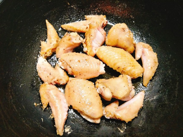 Bắt chảo lên bếp, đợi chảo nóng rồi cho gà đã ướp vào, đảo đều.