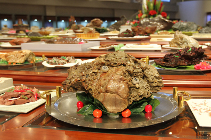 Đại yến tiệc Mãn Hán toàn tịch được mô phỏng bằng những tảng đá quý, gồm 1.088 món, bày trên mâm có đường kính 16,8m.