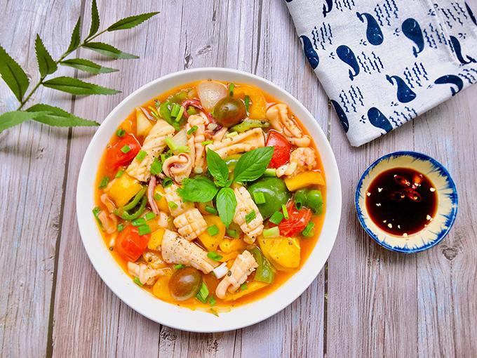 Mực xào các loại rau củ giòn giòn, thấm vị chua ngọt hấp dẫn, ăn cùng cơm nóng rất hợp.