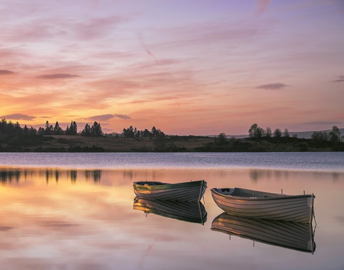 Hãy tưởng tượng sẽ yên bình như thế nào khi ngắm hoàng hôn ở hồ Loch Rusky, Scotland, khi chiếc thuyền của bạn lơ lửng trên mặt nước tựa như gương. Ảnh: transientlight
