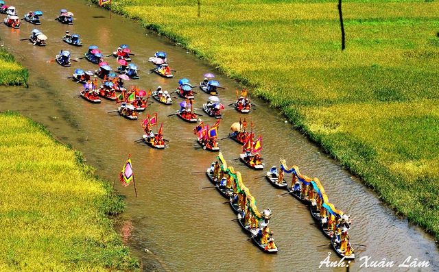 Trong tuần lịch Ninh Bình được tổ chức, du khách sẽ được hòa mình vào cánh đồng lúa chín, được tham gia lễ hội rước rồng trên sông Ngô Đồng, được thưởng thức những làn điệu dân ca như hát chèo, ca trù… là những di sản phi vật thể của nhân loại trên dòng sông thơ mộng (ảnh: Trường Huy).