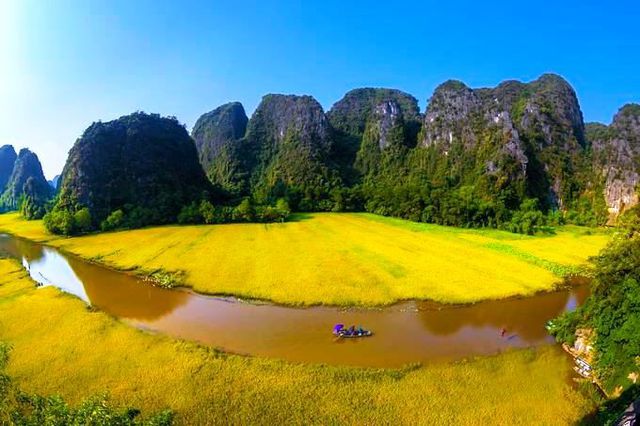 Mùa lúa chín, hai bên bờ sông Ngô Đồng vàng rực, dài như dải lụa tạo nên vẻ đẹp say đắm lòng người. Đến với Tam Cốc mùa này, du khách sẽ được ngắm “sắc vàng mê hồn” đẹp nhất trong năm ở cánh đồng lúa đẹp nhất Việt Nam.