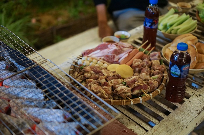 Bữa tiệc nướng giá 149.000 đồng/người với thịt, xúc xích và rau củ tươi trồng trong vườn nhà.