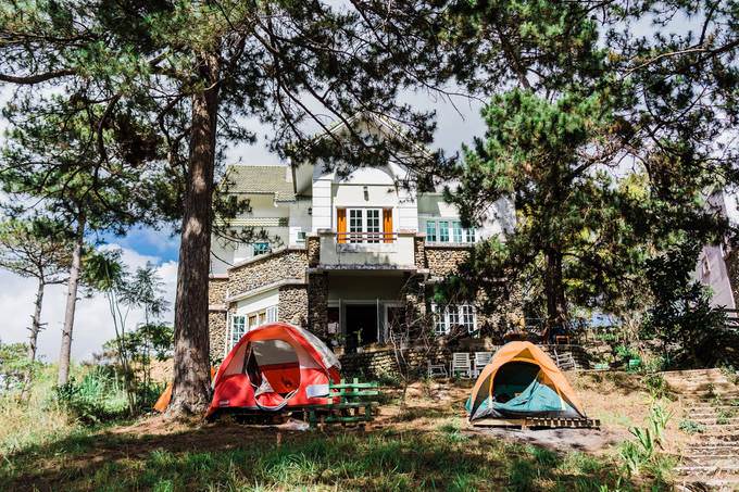 Nằm cùng hướng lên ga cáp treo hồ Tuyền Lâm, đây là một ngôi nhà khá rộng và ngập tràn cây xanh xung quanh. Homestay này kết hợp thêm dịch vụ quán cà phê, có cách bài trí đơn giản tạo cảm giác thân thiện, thư giãn.Homestay có cả phòng đôi, dorm, lẫn cho thuê lều trại. Mỗi phòng đôi giá 600.000 đồng, phòng tập thể giá 150.000 đồng mỗi giường, và lều cho thuê giá 120.000 đồng một đêm. Địa chỉ: 27 Đặng Thái Thân, phường 3. Ảnh: Khôi Nguyễn