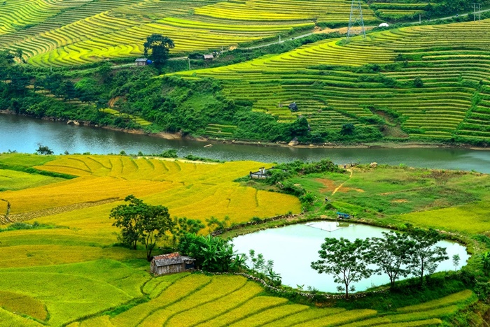 Hoàng Su Phì thuộc Hà Giang, nổi tiếng với những ruộng bậc thang lúa chín vàng óng ả vẽ nên những đường vân mềm mại bên sườn núi. Đến Hoàng Su Phì, bạn sẽ được thỏa sức tận hưởng cảnh sắc thiên nhiên hùng vĩ, thư giãn thoải mái trong bầu không khí trong lành với núi rừng trùng điệp.
