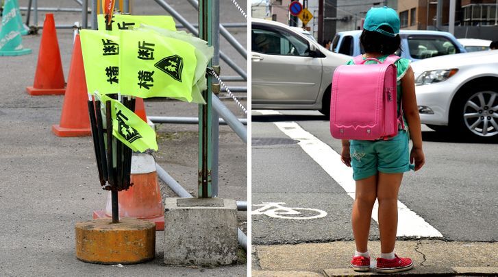 Trẻ em ở Nhật Bản thường tự đi lại, nên chúng sẽ phải sang đường mà không có sự giám sát của người lớn. Những lá cờ vàng được trang bị để cảnh báo những người lái xe ô tô rằng có người đang băng qua đường. Những lá cờ này có sẵn trên vỉa hè của những con đường đông đúc. Trẻ em có thể sử dụng cờ và trả chúng vào thùng ở bên kia đường.