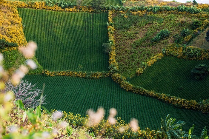 Ở đây, ngoài màu hoa dã quỳ rực rỡ, bạn còn được chiêm ngưỡng những cánh đồng xanh mướt rau quả, những con đèo uốn lượn quanh co, những rặng núi mờ xa, những đàn trâu thong thả trên đồi cỏ may…