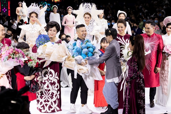 Hoá thân thành những cặp tân lang – tân nương trong ngày trọng đại, các nghệ sĩ chọn các thiết kế áo dài mang màu đỏ, trắng với hàng loạt họa tiết rồng phụng, tự tin sải bước trên sàn diễn.