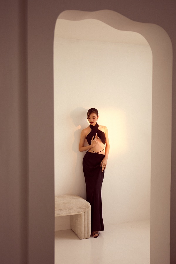 Trong bộ váy đen, nàng hậu 10x khoe khéo vòng eo con kiến và đôi vai thon thả đầy gợi cảm.