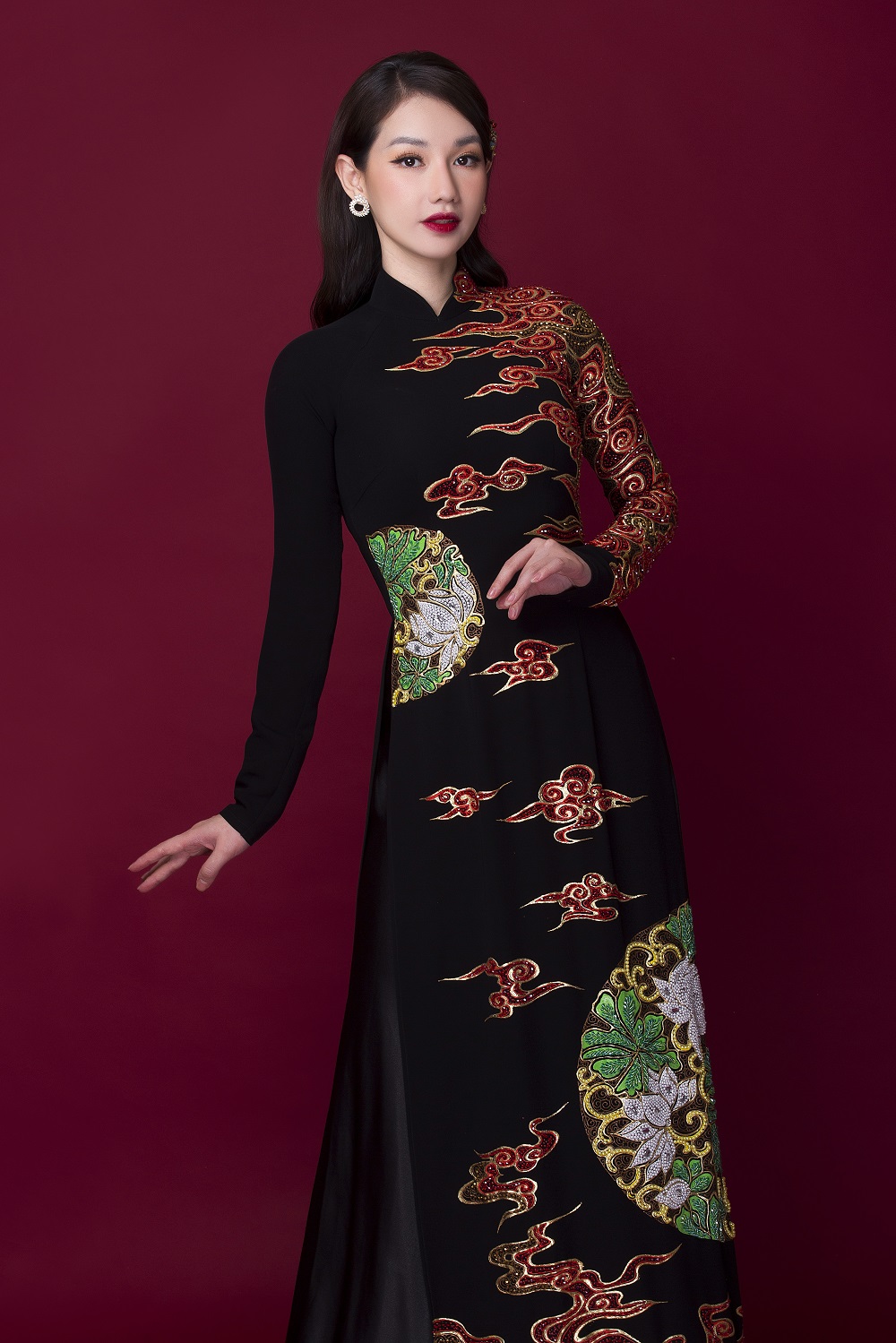 Nếu như kiểu áo dài đỏ tôn lên sự sắc sảo, mặn mà, mẫu áo dài trắng toát lên sự thanh khiết khi kiểu áo màu đen tuyền giúp Quỳnh Chi trở nên quyền lực.