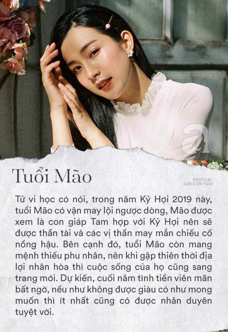 Trời sinh tuổi Mão là những người sống tình cảm, luôn biết nghĩ cho người khác và mong muốn một cuộc sống yên bình, ổn định. Đa số những người tuổi Mão không quá tham vọng, nhưng họ không ngừng cố gắng, nỗ lực để xây dựng cho mình một cuộc đời đầy đủ, hạnh phúc, không thiếu thứ gì. Tuổi Mão là một trong những con giáp được trời ban nhiều phúc đức, xung quanh họ luôn có nhiều quý nhân che chở, bảo vệ, không bao giờ rơi vào đường cùng bế tắc. Tử vi học có nói, trong năm Kỷ Hợi 2019 này, tuổi Mão có vận may lội ngược dòng, Mão được xem là con giáp Tam hợp với Kỷ Hợi nên sẽ được thần tài và các vị thần may mắn chiếu cố nồng hậu. Bên cạnh đó, tuổi Mão còn mang mệnh thiếu phu nhân, nên khi gặp thiên thời địa lợi nhân hòa thì cuộc sống của họ cũng sang trang mới. Dự kiến, cuối năm tình tiền viên mãn bất ngờ, nếu như không được giàu có như mong muốn thì ít nhất cũng có được nhân duyên tuyệt vời.