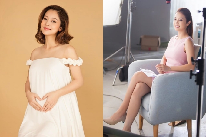 Nhờ vóc dáng cao ráo, Lan Khuê không thay đổi nhiều khi mang thai con trai đầu lòng (ảnh trái). Do đó sau sinh cô nhanh chóng giảm 5 kg, thon gọn như thuở son rỗi. Cô còn khoe bức ảnh diện vừa chiếc áo cũ nhiều năm trước (ảnh phải).