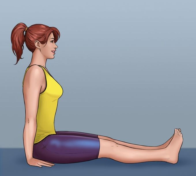 Ngồi trên sàn với tư thế thẳng lưng và hai chân duỗi thẳng trước mặt, hai tay chống xuống sàn đặt sát bên hông. Giữ thẳng lưng, hít thở sâu, giữ nguyên tư thế trong 7 phút. Tư thế này đơn giản nhưng đòi hỏi vận động toàn bộ cơ thể, giúp giảm đau lưng rất hữu hiệu.