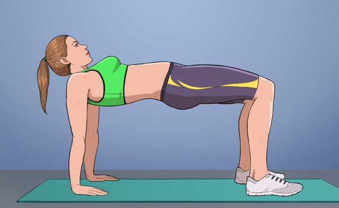 Bắt đầu bằng tư thế ngồi, hai tay chống phía sau lưng, nâng cao người sao cho tay và chân tạo góc 90 độ so với thân người. Giữ trong vài nhịp thở rồi trở về tư thế chuẩn bị. Lặp lại động tác 10 lần.