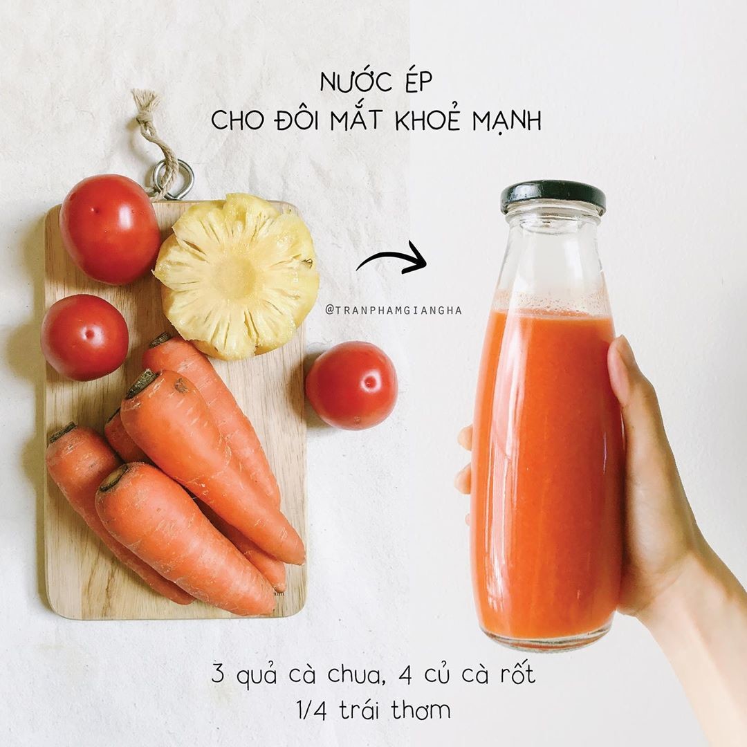 Cà rốt, cà chua, dứa đều là các loại quả chứa nhiều vitamin A, C… có lợi cho làn da, giúp ngăn ngữa lão hóa, thúc đẩy quá trình tái tạo da. Nước ép cà chua, cà rốt và dứa còn có tác dụng kích thích sự tiết mật, tăng tốc độ trao đổi chất và thúc đẩy quá trình giảm cân.