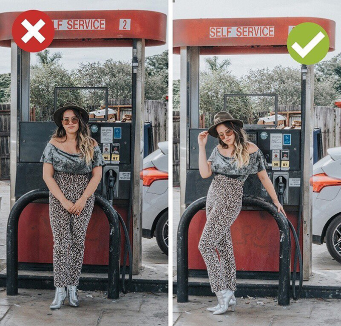 Để tránh cảm giác “đơ”, phái đẹp nên đứng nghiêng nhẹ thay vì trực diện trước ống kính. Điều này càng quan trọng nếu bạn muốn vóc dáng trông mảnh mai hơn.