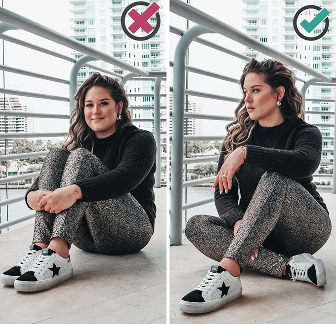 Đừng ngồi bó gối một cách nhạt nhẽo. Gợi ý tuyệt vời hơn là thẳng lưng, đẩy cao một bên đầu gối và đặt một tay lên đó, tạo thành hình tam giác kép. Tư thế ngồi này cho thấy bạn là một cô gái tự tin, hấp dẫn.