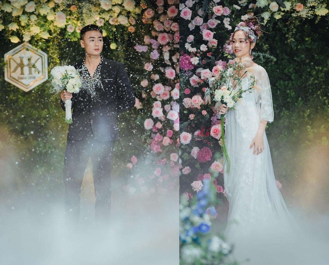 Điểm nhấn đáng chú ý nhất là chiếc váy cưới, áo dài cưới được thiết kế toàn bộ bằng hoa tươi nhập khẩu cũng chính là món quà ý nghĩa mà Hoàng Khánh muốn gửi tặng khán giả.
