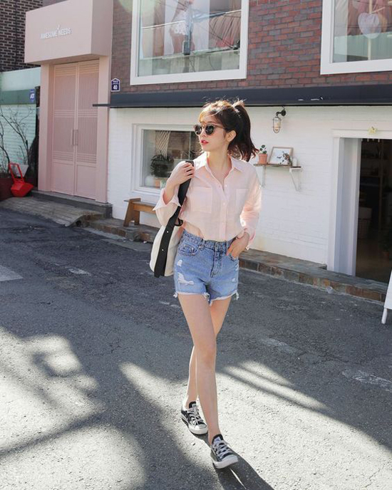 Xuống phố vào những ngày cuối tuần, phái đẹp chỉ cần chọn sơ mi, short, giầy đế bệt cũng đủ thể hiện phong cách đơn giản nhưng không kém phần sexy.