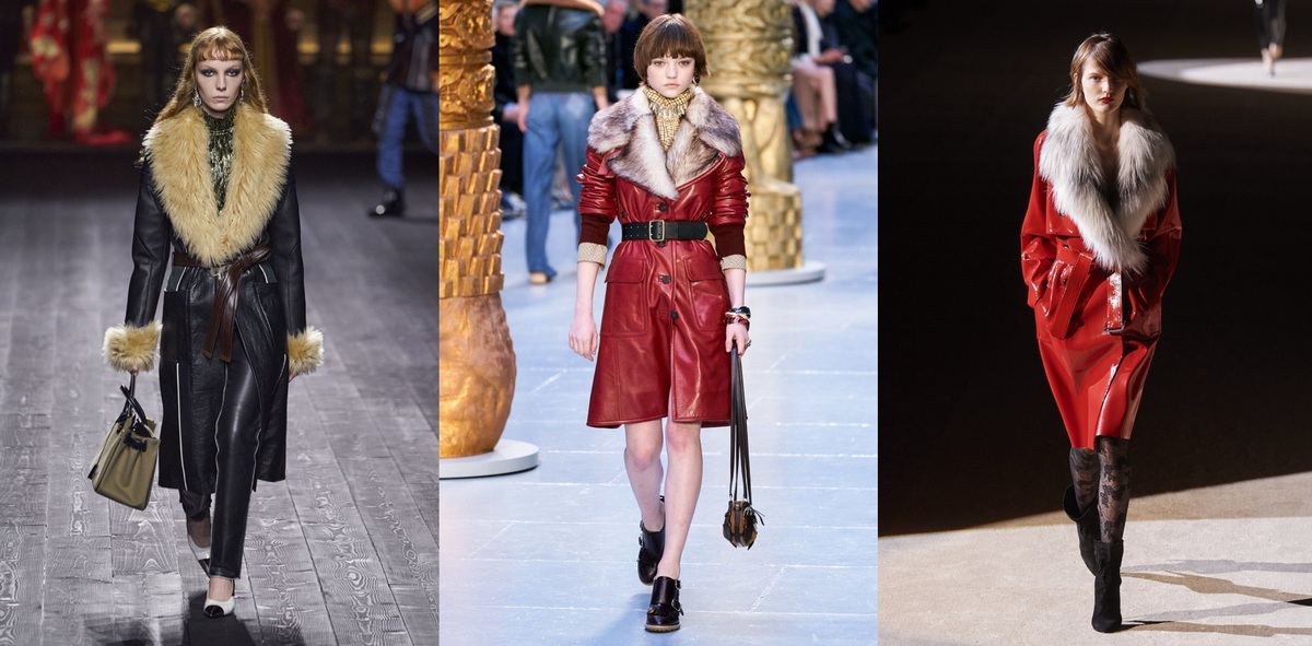 t8Loạt trench coat cổ gắn lông đi kèm vải da bóng gợi hoài niệm về những bữa tiệc xa hoa của giới thượng lưu phương Tây 50 năm trước. Mùa này, Louis Vuitton, Chloé, Saint Laurent… mang phong cách thập niên 1970 trở lại đường băng. Tín đồ thời trang có thể tôn dáng bằng cách phối với thắt lưng, khoác ngoài quần jeans ống loe, boots cao cổ. Ảnh: Imaxtree.