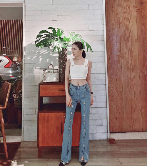 Ngoài quần short khoe chân nuột nà, các kiểu quần jeans ống đứng, jeans ống suông ‘ăn gian chiều cao’ cũng được Lệ Quyên ưa chuộng.
