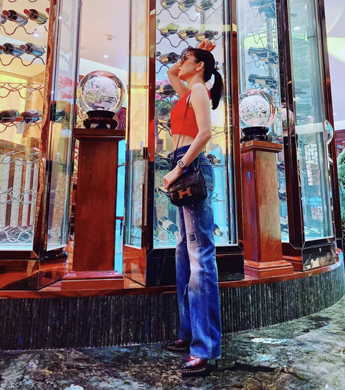 Các mẫu quần jeans dài gần hai gang tay thường được Lệ Quyên mix cùng áo hở eo, áo thun ôm để khoe thành quả sau nhiều ngày giảm cân và tập thể thao.
