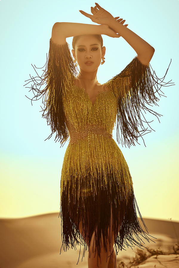 Để kỷ niệm sự kiện ý nghĩa này, Khánh Vân công bố bộ ảnh đặc biệt, được thực hiện trên đồi cát Phan Thiết những ngày đầu tháng 4 trước khi lên đường sang Mỹ. Trong trang phục đầm tua rua màu sắc rực rỡ, Khánh Vân nổi bật giữa đồi cát vào lúc bình minh, hoà quyện với khung cảnh tạo nên một bố cục hài hoà.