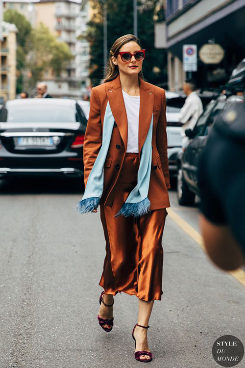 Quý cô văn phòng sang chảnh với set đồ nâu, nâu đồng bóng bẩy qua cách mix áo blazer dáng rộng, chân váy lụa mềm mại.