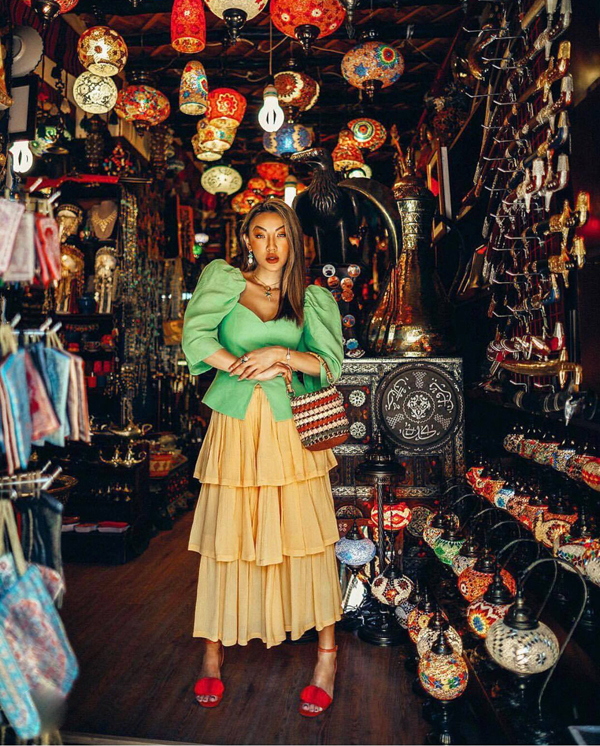 Áo vai bồng, chân váy xếp tầng, sandal màu đơn sắc được hòa trộn một cách ấn tượng để mang tới set đồ dạo phố.