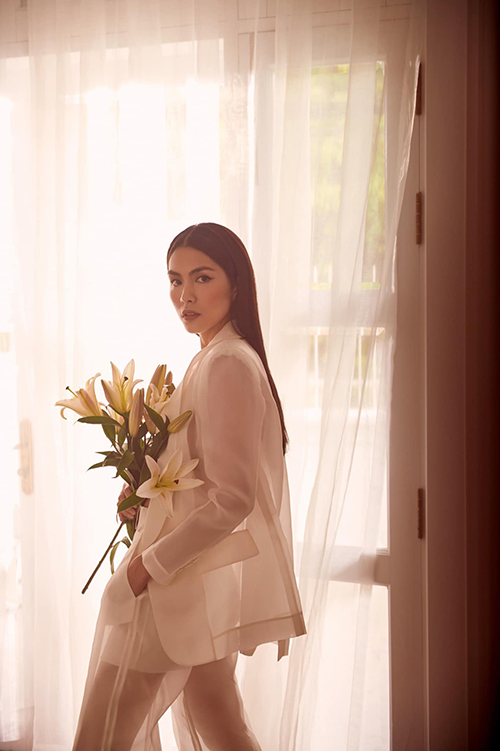 Tăng Thanh Hà nhận được nhiều lời khen ngợi từ fan và bạn bè đồng nghiệp khi khoe hình ảnh diện suit kiểu cách, khoe dáng bên hoa ly.