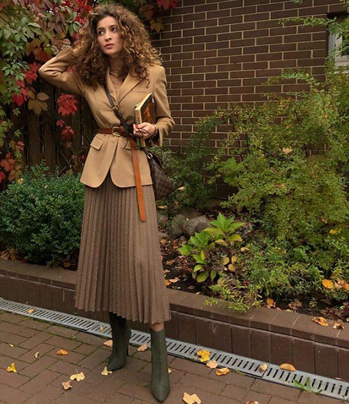 Chân váy xếp ly vẫn có thể sử dụng trong ngày lạnh nhưng phải kèm thêm những món đồ giữ ấm hiệu quả như áo blazer, áo len cổ lọ và thậm chí măng tô.