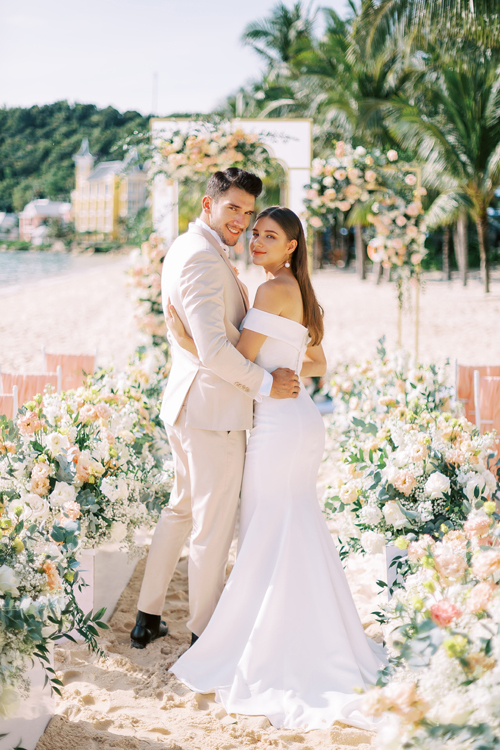 Chiếc váy cưới tiếp theo được thiết kế với mong muốn biến cô dâu trở thành bông hoa rạng rỡ nhất trong hôn lễ nơi vùng biển đầy nắng vàng, sóng dồn và cát trắng.