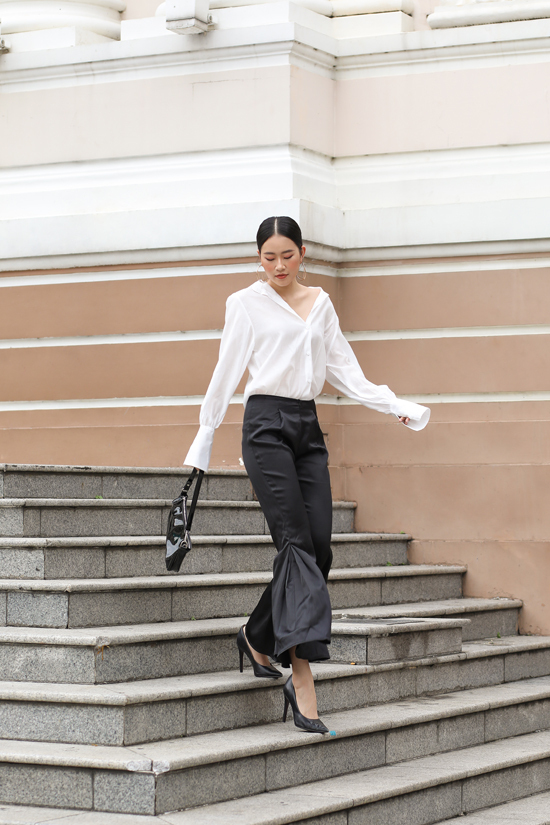 Set đồ gam màu tương phản với hai tông đen – trắng cơ bản nhưng vẫn giúp Thạch Thảo hút mắt bởi sơ mi và quần lụa kiểu dáng độc đáo.