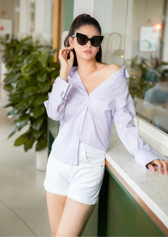 Các nàng trông sẽ có một chút cá tính và sexy với sơ mi biến tấu độc đáo đi cùng short trắng. Tuy nhiên đây không phải set đồ dễ sử dụng khi đến văn phòng.