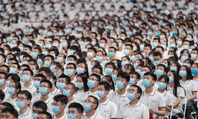 Sinh viên năm nhất đeo khẩu trang trong lễ khai giảng tại Đại học Vũ Hán ở Vũ Hán, tỉnh Hồ Bắc, Trung Quốc hôm 26/9. Ảnh: AFP.