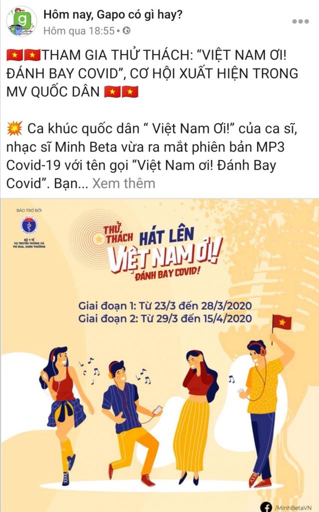 Ngoài dự án “Việt Nam ơi! Đánh bay COVID”, mạng xã hội Gapo còn đồng hành cùng nhiều MV tuyên truyền về COVID-19 như: Tự giác cách ly (Bùi Công Nam, ra mắt ngày 26/3); Bài ca Corona (Tuấn Cry – Ft. Trần Thanh Tâm, Hot Tiktoker Trứng rán, ra mắt ngày 31/3).