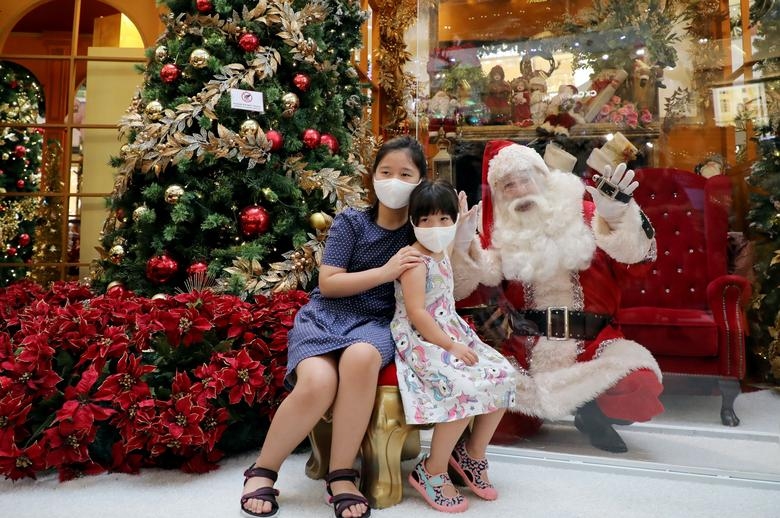 Hai bé gái đeo khẩu trang chụp ảnh cùng ông già tuyết đằng sau tấm chắn trong suốt ở một trung tâm thương mại tại thủ đô Kuala Lumpur, Malaysia, hôm 9/12, để tránh nguy cơ lây nhiễm nCoV.